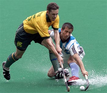 Kevin Chree of South Africa is challenged by Mario Almada of Argentina during the Champions Challenge hockey match at the Bukit Jalil national hockey stadium, in Kuala Lumpur, Malaysia.