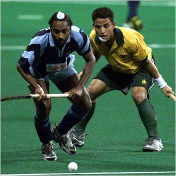Baljit Singh Dhillon is challenged by Kevin Chree of South Africa during the final of the Champions Challenge Trophy hockey tournament at the Bukit Jalil National Hockey stadium in Kuala Lumpur, Malaysia.