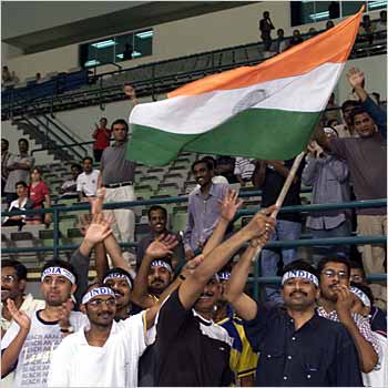 Indian fans celebrate the team's victory over South Africa, at Kuala Lumpur.