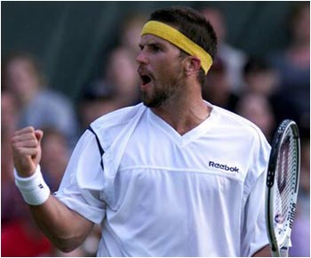 Patrick Rafter celebrates his victory over Hicham Arazi during the men's third round of The All England Lawn Tennis Championship at Wimbledon, London. Rafter won a relatively easy encounter 7-6, 6-4, 7-5.