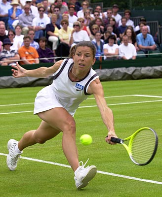 Karen Cross of Great Britain stretches to reach a return from Lisa Raymond of the US in a women's second round match. Raymond, seeded 28, won 6-0, 6-1.