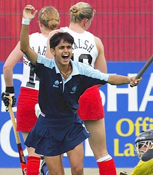 Mamta Kharab of India celebrates after scoring the first goal against England in the women's hockey final at the Belle Vue Hockey Centre during the 2002 Commonwealth Games in Manchester, England. India won 3-2 and claimed the gold in the competition.