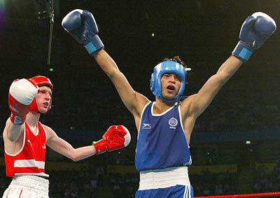 Mohammad Ali Qamar raises his arms in triumph after being declared winner over Darren Langley of England in the men's Light-flyweight final. Qamar was the only Indian pugilist to return from the Games with a gold medal.