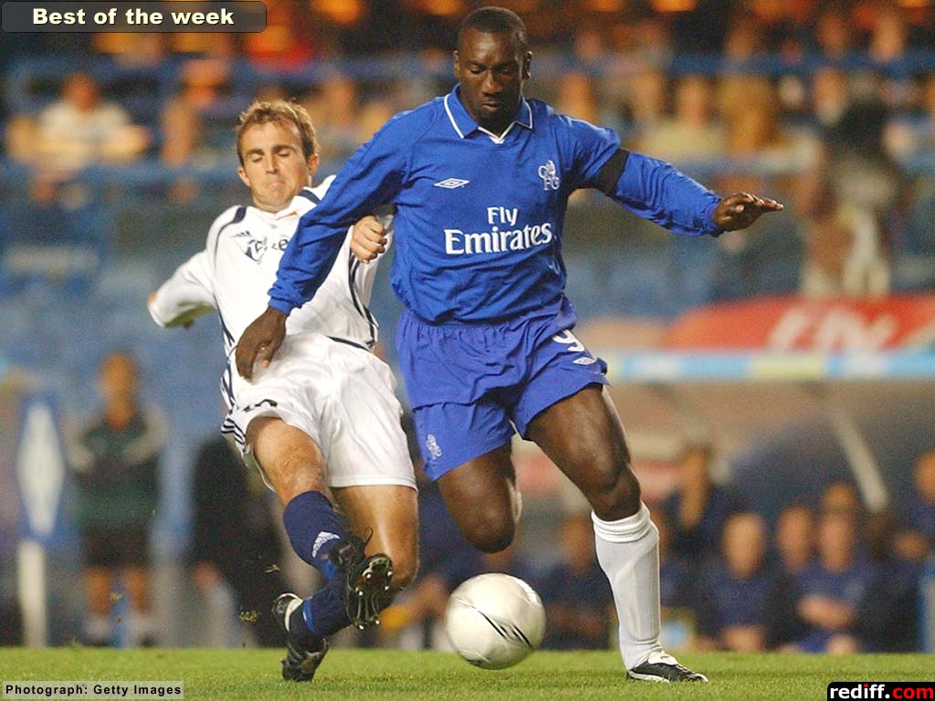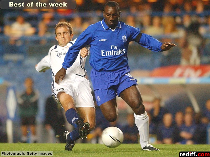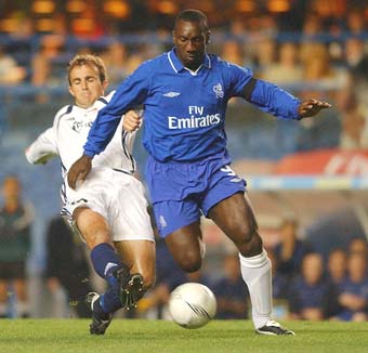 Jimmy Floyd Hasselbaink of Chelsea battles with Trygve Nygaard of Viking FK during the UEFA Cup First Round First Leg match between Chelsea and Viking FK at Stamford Bridge in London.