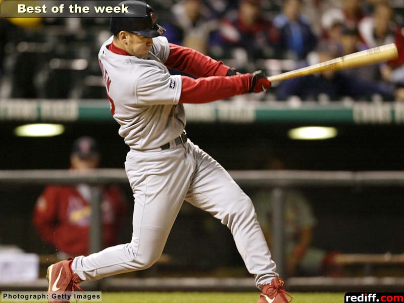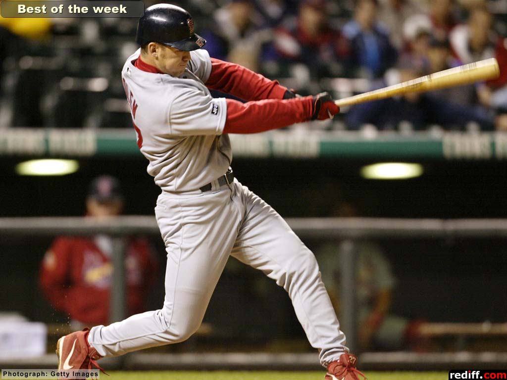 Scott Rolen #27 of the St. Louis Cardinals hits a two-run home run against the Colorado Rockies in the ninth inning at Coors Field in Denver, Colorado.