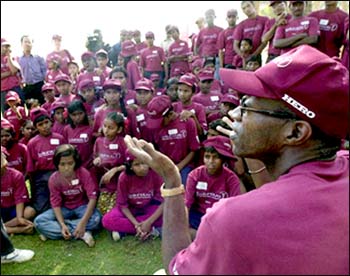 The nine-time 400 metres hurdles world record holder addresses the kids.