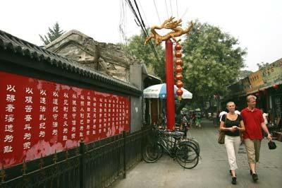 Top: Foreign tourists tour the Liulichang culture street where old buildings and alleyways are undergoing a facelift in preparation for the 2008 Olympics.