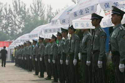 Top: Security guards stand at attention during a training session on July 24, 2007 in Beijing, China. China will step up security guard training in its occupational education in an effort to have more qualified personnel.