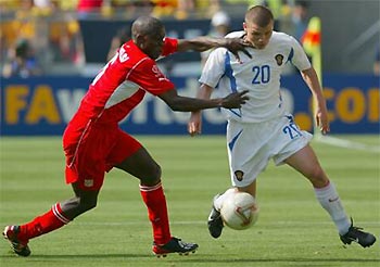 Hatem Trabelsi of Tunisia uses his hands to check Marat Izmailov of Russia during the Group H match. Russia won 2-0.