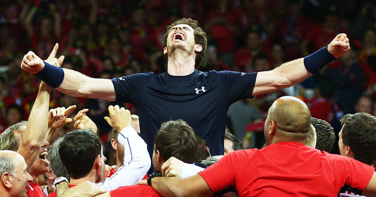 Murray was immediately swamped by his teammates, captain Leon Smith and the support staff and was hoisted shoulder high on the court before saluting the dancing British fans.