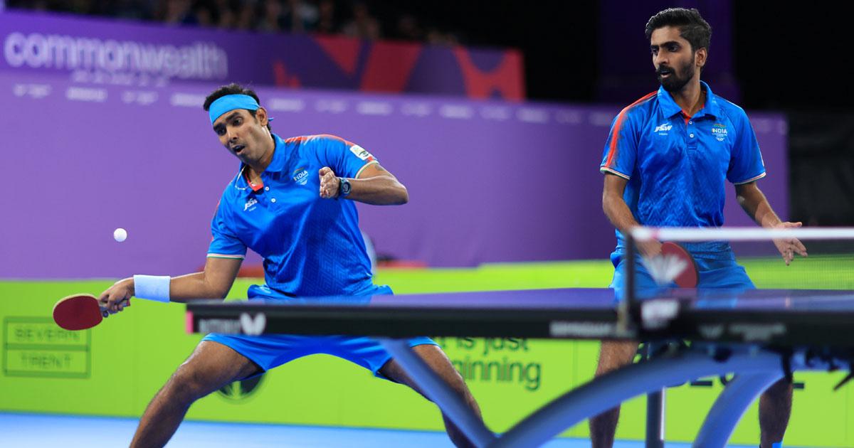 IMAGE: Sharath Kamal and Gnanasekaran Sathiyan. Photograph: Alex Pantling/Getty Images from Rediff Archives
