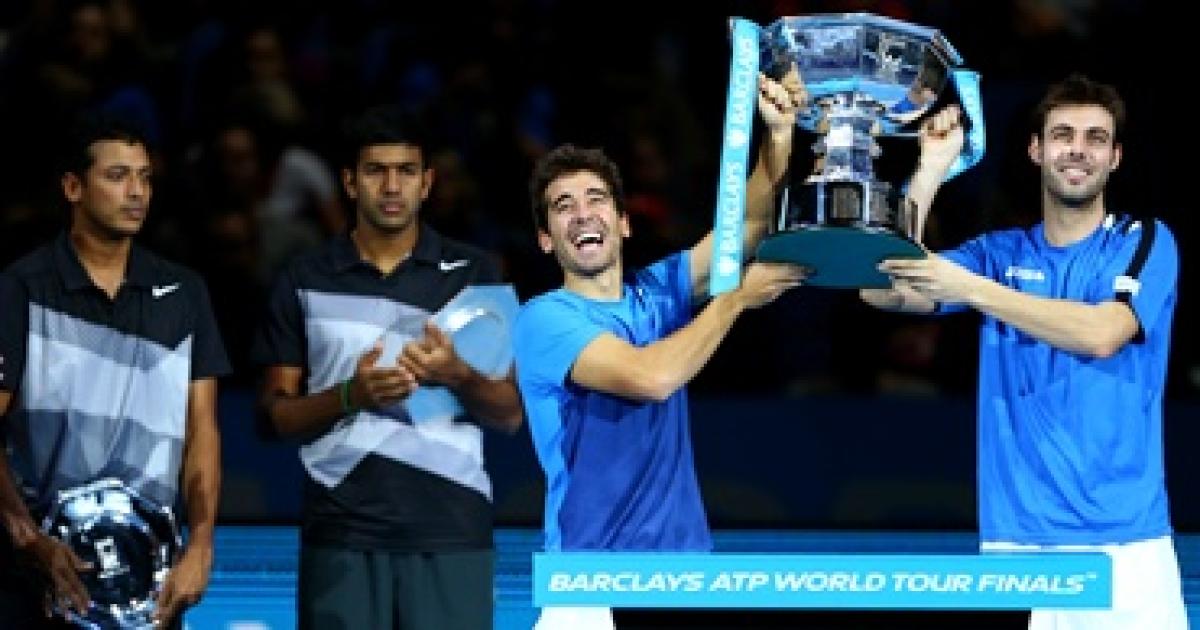 Marcel Granollers and Marc Lopez became the first Spanish pair to win the doubles title at the ATP Tour Finals for 37 years on Monday with a narrow victory over Indian duo Mahesh Bhupathi and Rohan Bopanna.