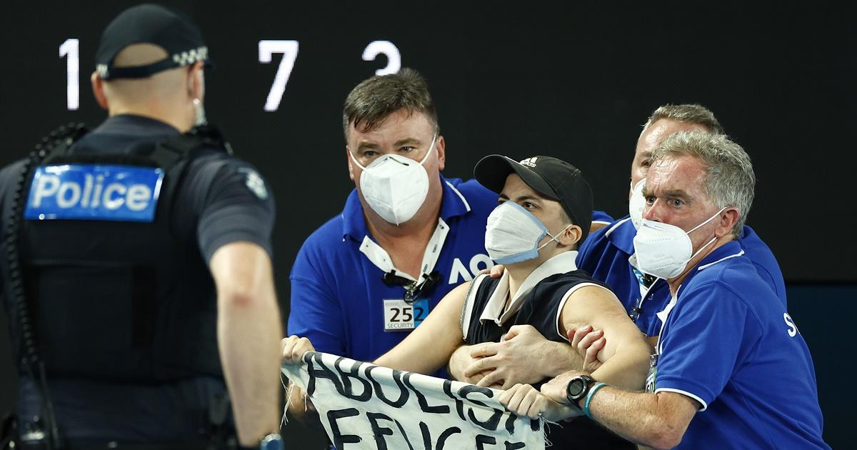 Security officials promptly made a human shield around the players as some others dragged the person, who appeared to carry a banner reading 'abolish refugee detention', off the court at the Rod Laver Arena.