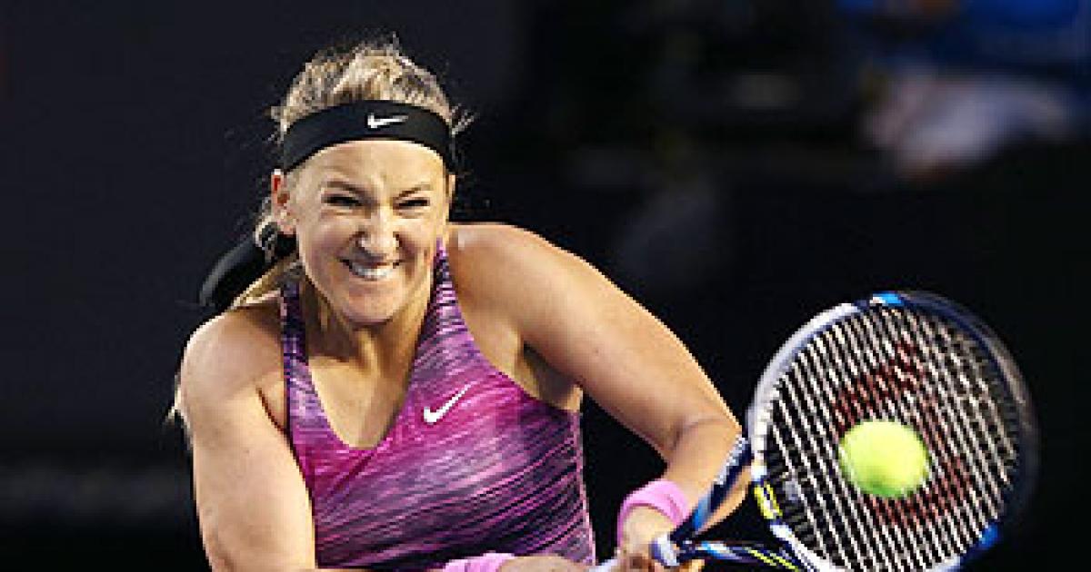 Image: Victoria Azarenka of Belarus plays a backhand in her third round match against Yvonne Meusburger of Austria at the Australian Open in Melbourne on Saturday