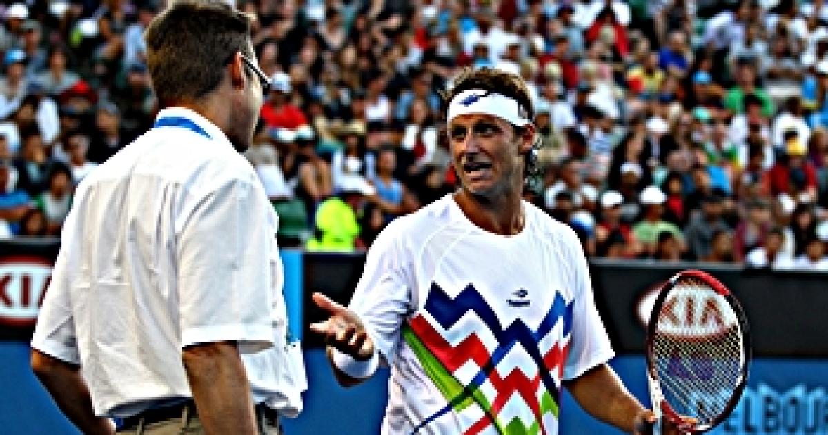 David NalbandianA non-plussed Nalbandian remonstrated with Nouni for some minutes as boos and jeering rang out in the stands at Margaret Court Arena, before he grudgingly returned to the baseline with the score at deuce.