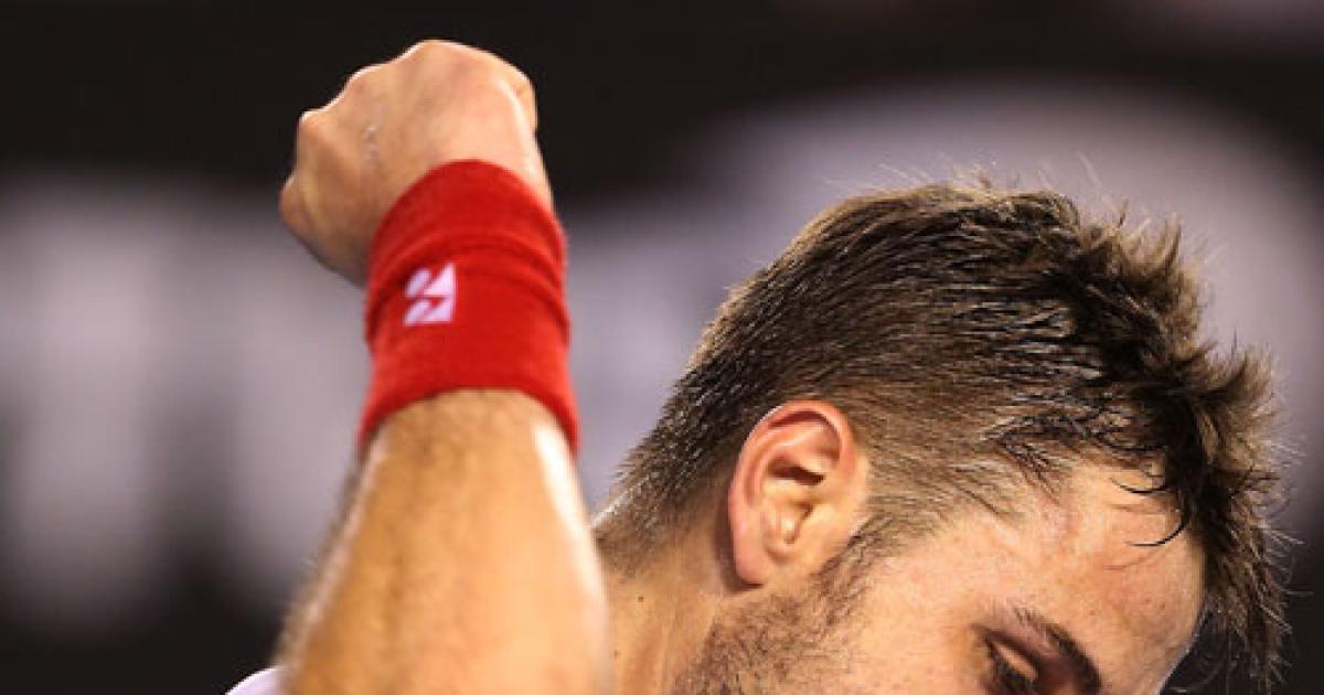 Image: Stanislas Wawrinka of Switzerland celebrates a point against Novak Djokovic of Serbia during the Australian Open at Melbourne Park.