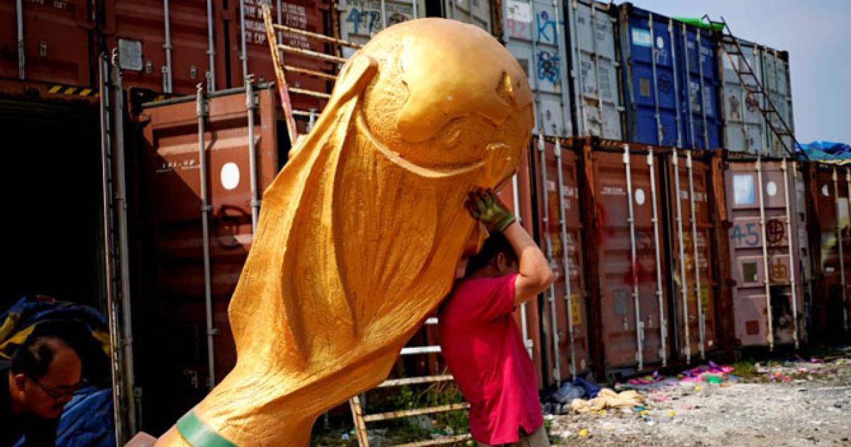 Workers work on a FIFA World Cup trophy replica at a small factory in the outskirts of Shanghai, China