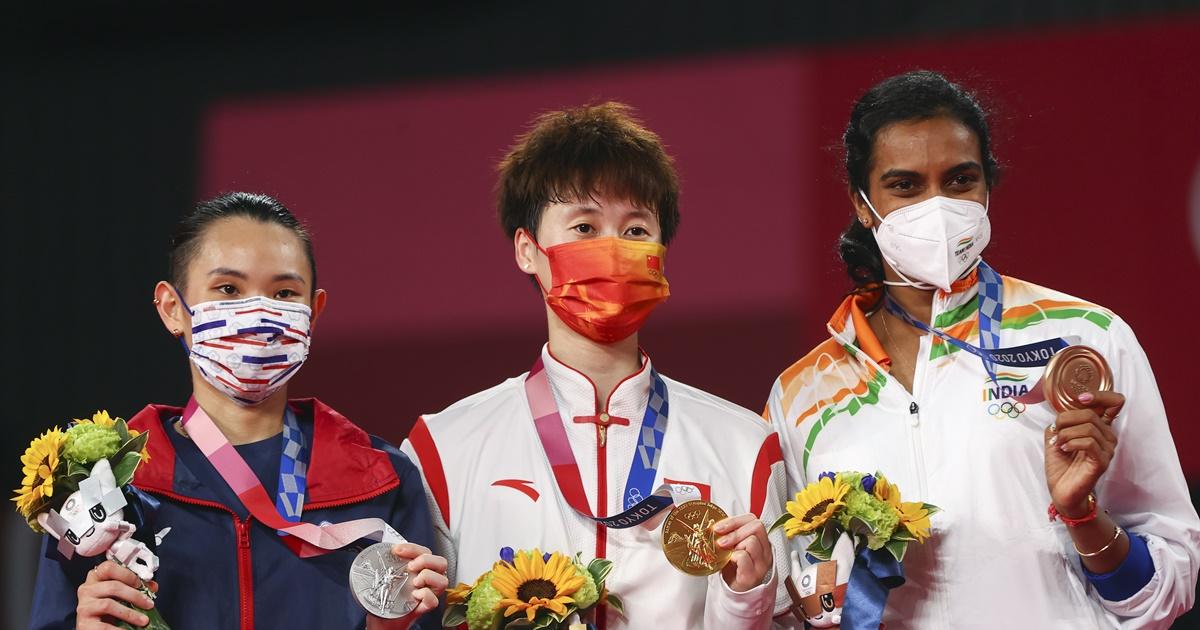 Gold medallist Chen Yufei of China, silver medallist Tai Tzu-Ying of Taiwan and bronze medallist P V Sindhu of India pose with their medals won from the women's singles badminton at the Tokyo Olympics on Sunday.