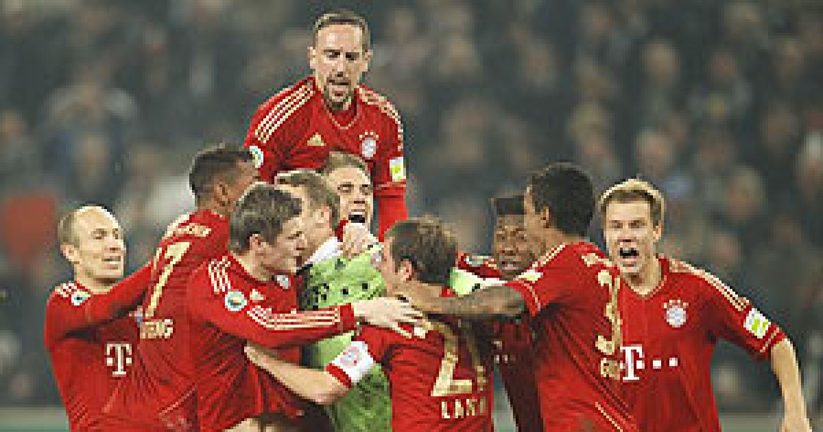 Bayern Munich set up a mouth-watering German Cup final with Bundesliga champions Borussia Dortmund after beating Borussia Moenchengladbach on penalties on Wednesday to keep their treble chances on track.