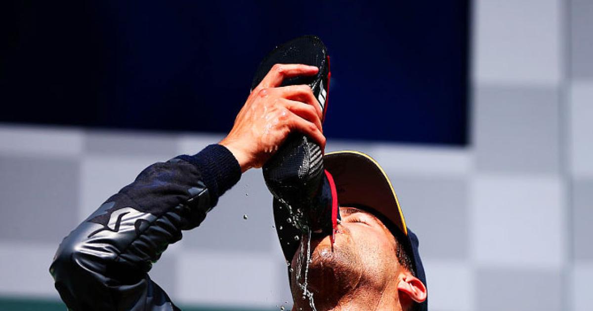 IMAGE: Red Bull Racing’s Australian driver Daniel Ricciardo drinks champagne from his boot as he celebrates on the podium during the Formula One Grand Prix of Belgium at Circuit de Spa-Francorchamps in Spa, Belgium, on Sunday, August 28. Photograph: Dan Istitene/Getty Images
