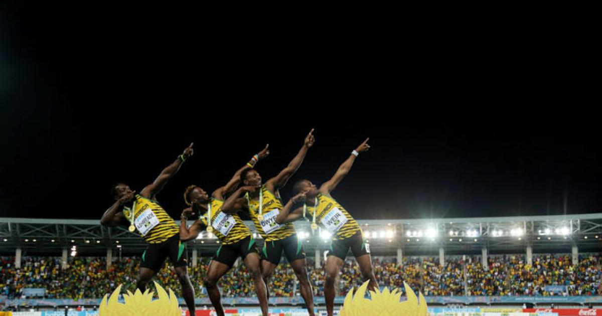 Image: Nickel Ashmeade, Rasheed Dwyer, Jason Livermore, and Warren Weir of Jamaica celebrate after winning the final of the men's 4 x 200 metres relay on day two of the IAAF/BTC World Relays, Bahamas 2015 at Thomas Robinson Stadium in Nassau, Bahamas, on Saturday