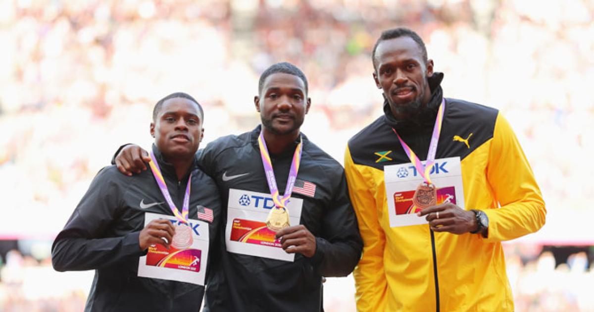 (L-R) Silver medallist Christian Coleman of the United States, gold medallist Justin Gatlin of the United States, and bronze  medallist Usain Bolt of Jamaica, pose with their medals for the Men's 100 metres during day three of the 16th IAAF World Athletics Championships at The London Stadium in London, on Sunday