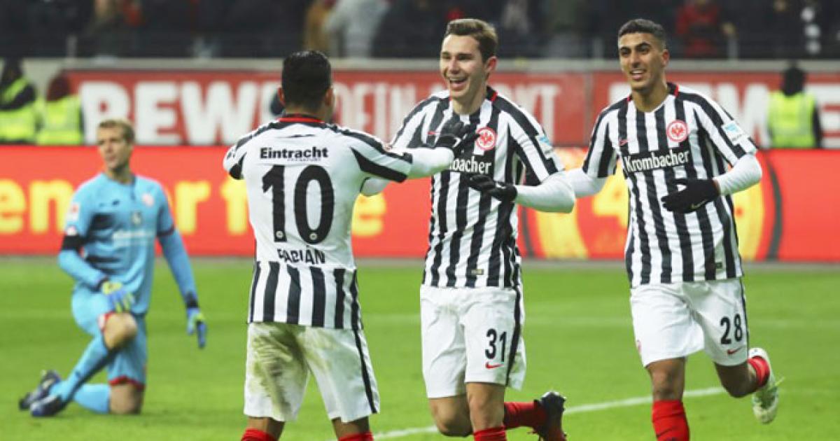 Eintracht Frankfurt moved up to third on 29 after beating 10-man Mainz 05 3-0 with Branimir Hrgota scoring twice as they secured a fourth victory in their last seven league games.