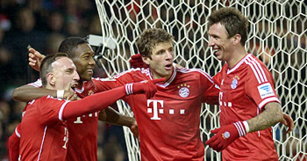 Image: Bayern Munich's (left to right) Franck Ribery, David Alaba, Thomas Mueller and Mario Mandzukic celebrate after scoring against Werder Bremen during their Bundesliga match in Bremen, on Saturday