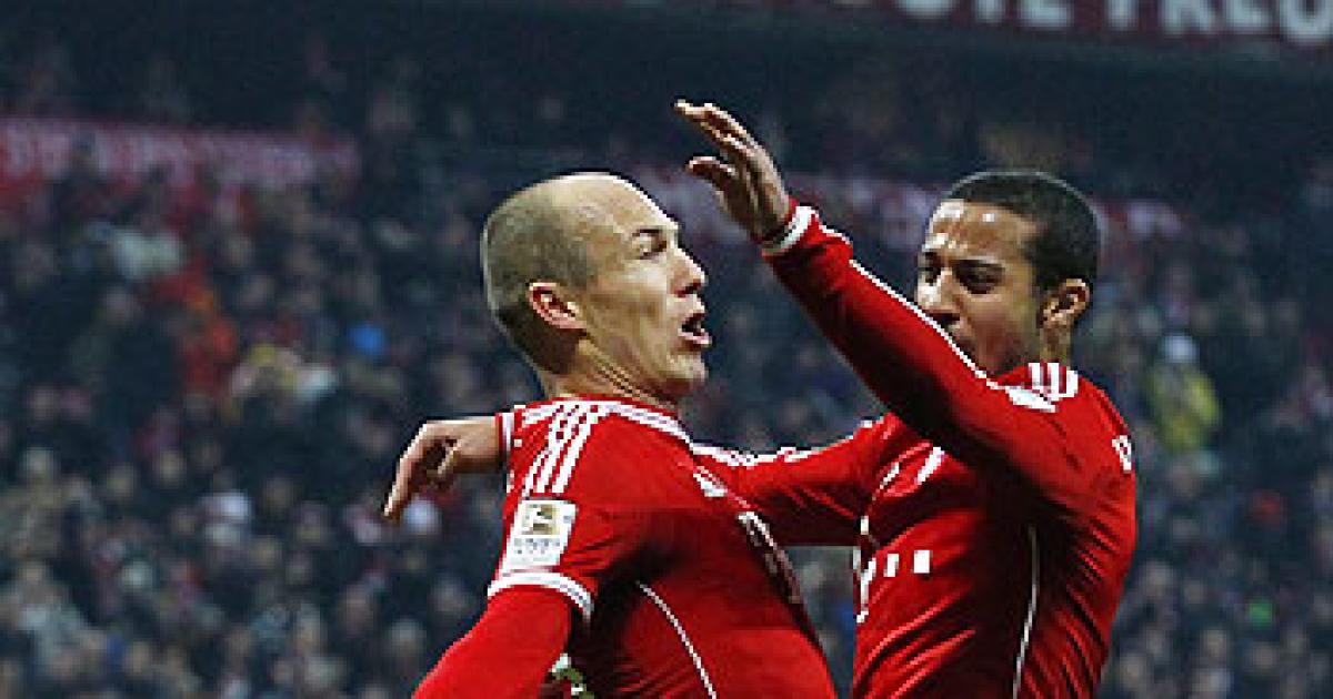 Image: Bayern Munich's Arjen Robben (L) and Thiago jump in the air while celebrating a goal during their German Bundesliga match against Schalke 04 in Munich on Saturday