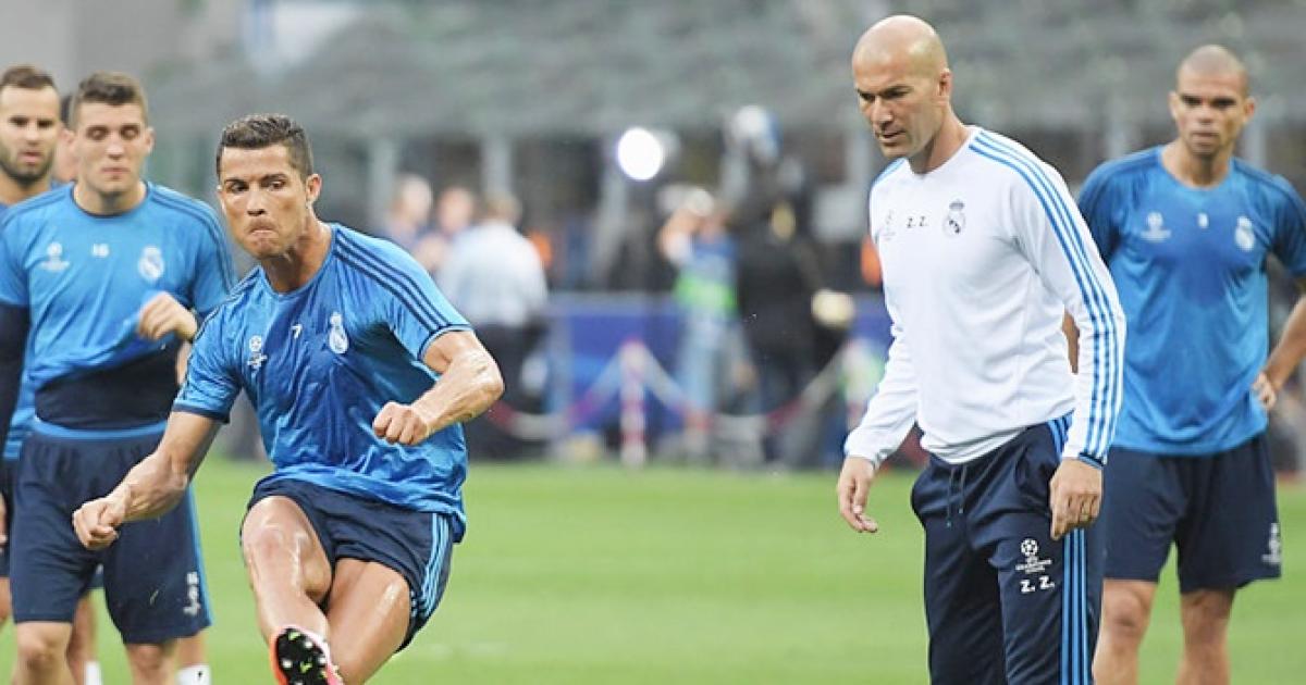 IMAGE: Cristiano Ronaldo of Real Madrid has a shot as head coach Zinedine Zidane looks on during a training session. Photograph: Matthias Hangst/Getty Images.