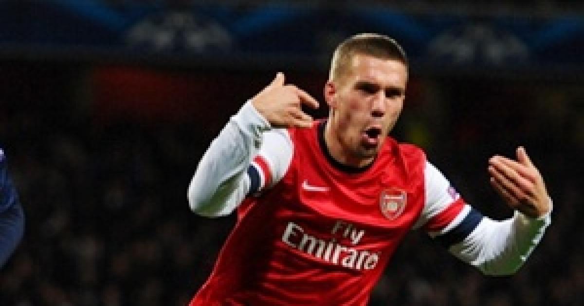 Image: Lukas Podolski of Arsenal celebrates scoring their second goal during the UEFA Champions League Group B match against Montpellier Herault SC.