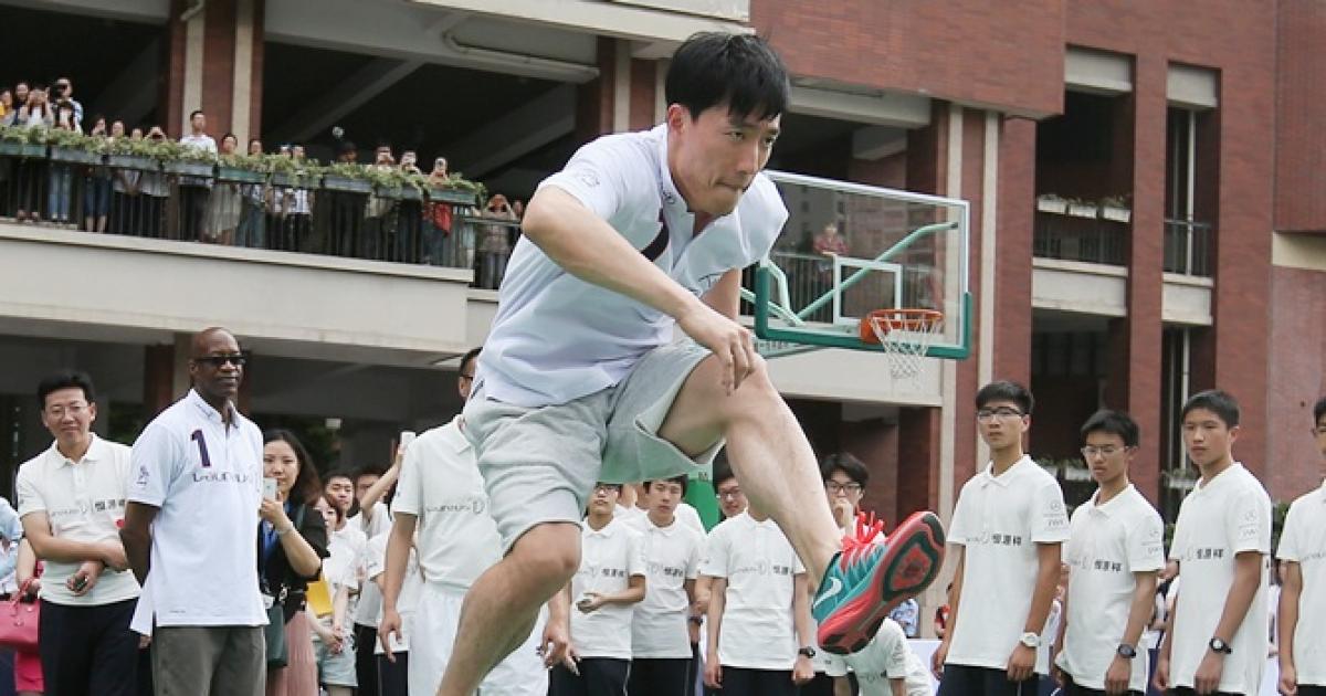 Olympic 110m hurdle champion Liu Xiang, centre, stages huddle race performance. Photograph: Feng Li/Getty Images for Laureus