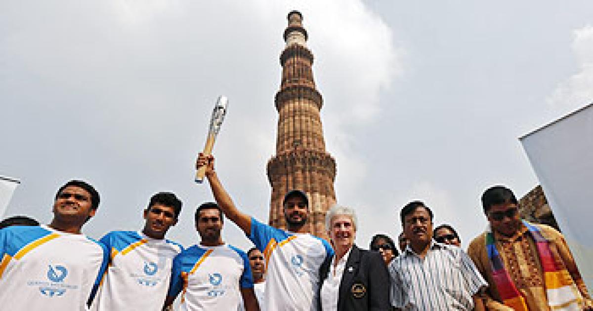 Image: Indian field hockey player Harhir Singh (centre) holds the Commonwealth Games Baton as he poses with Louise Martin, Board Member of Commonwealth Games Federation, and other players and officials in front of 13th century Qutub Minar in New Delhi on Sunday