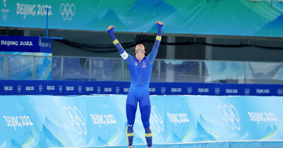 The Swede, who broke the world record at Salt Lake City two months ago, trailed Dutchman Patrick Roest by over a second throughout the race but stormed to victory in an Olympic record time of six minutes 08.84 seconds.