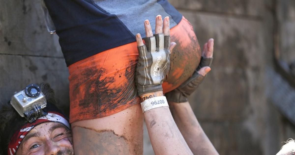 Participants climb over a wall at the 'Tough Mudder' endurance event series in Arnsberg September 6, 2014. Competitors who took part in the endurance event saw themselves having to overcome various military style obstacles. Photograph: Ina Fassbender/Reuters