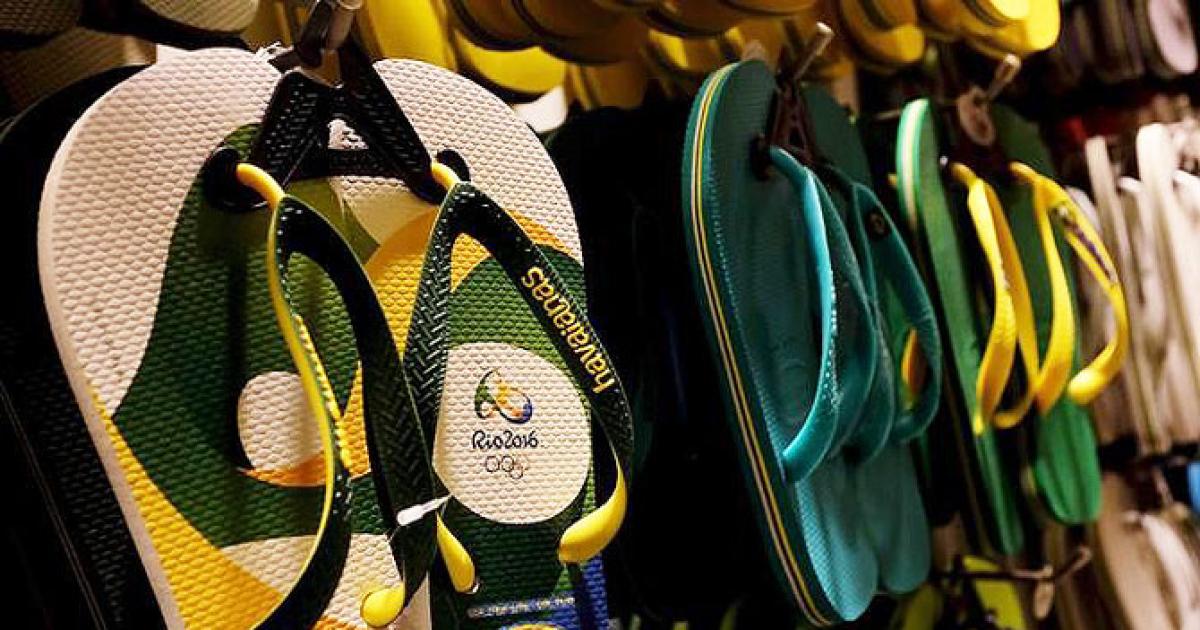 The official logo of the Rio summer Olympic 2016 games is seen on a pair of flip flops at a shop in Sao Paulo