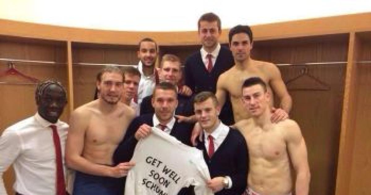 Arsenal players reportedly posted a picture on social media site Twitter, holding a shirt with a get well soon message for Formula One champion Michael Schumacher, who is fighting for his life following a ski accident.
