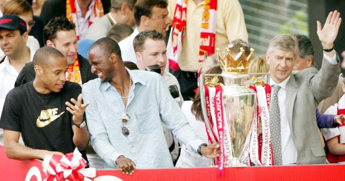 IMAGE: Arsenal's Thierry Henry, Patrick Viera and manager Arsene Wenger celebrate their EPL title-win during a victory parade in north London on May 16, 2004. Photograph: /Peter Macdiarmid/File Photo/Reutesr