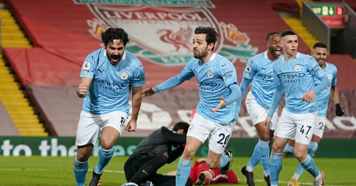 An emphatic win, City's 10th in a row in the league and first at Anfield since 2003, moved Pep Guardiola's side to 50 points from 22 games, five more than second-placed Manchester United, who have played a game more.