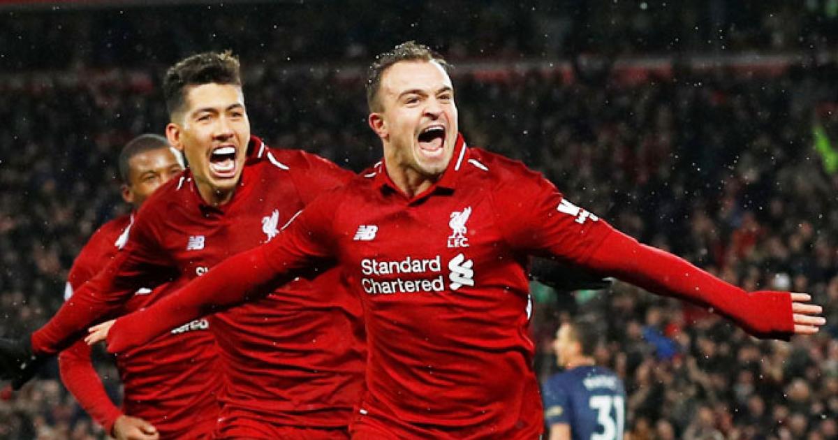 Two second-half goals from substitute Xherdan Shaqiri gave Liverpool a 3-1 Premier League win over Manchester United at Anfield on Sunday as Juergen Klopp's side regained top spot with a pulsating performance in the North West derby.