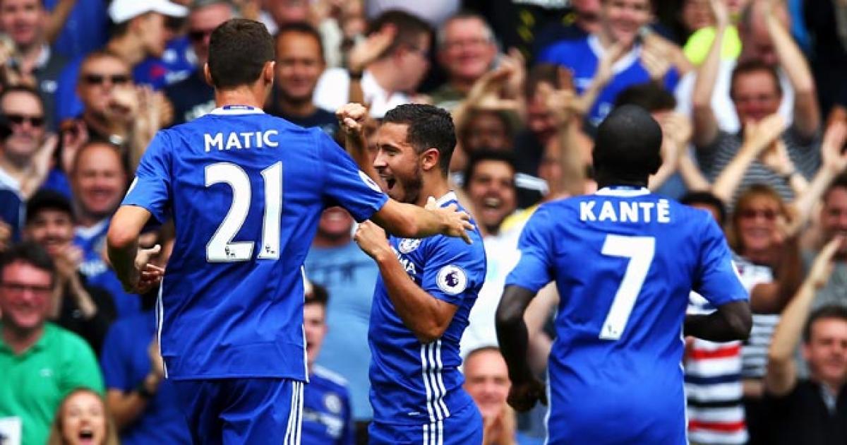 Goals from Eden Hazard, Willian and Victor Moses sent Antonio Conte's Chelsea to the top of the Premier League on Saturday with a 3-0 win over promoted Burnley in a one-sided match at Stamford Bridge.