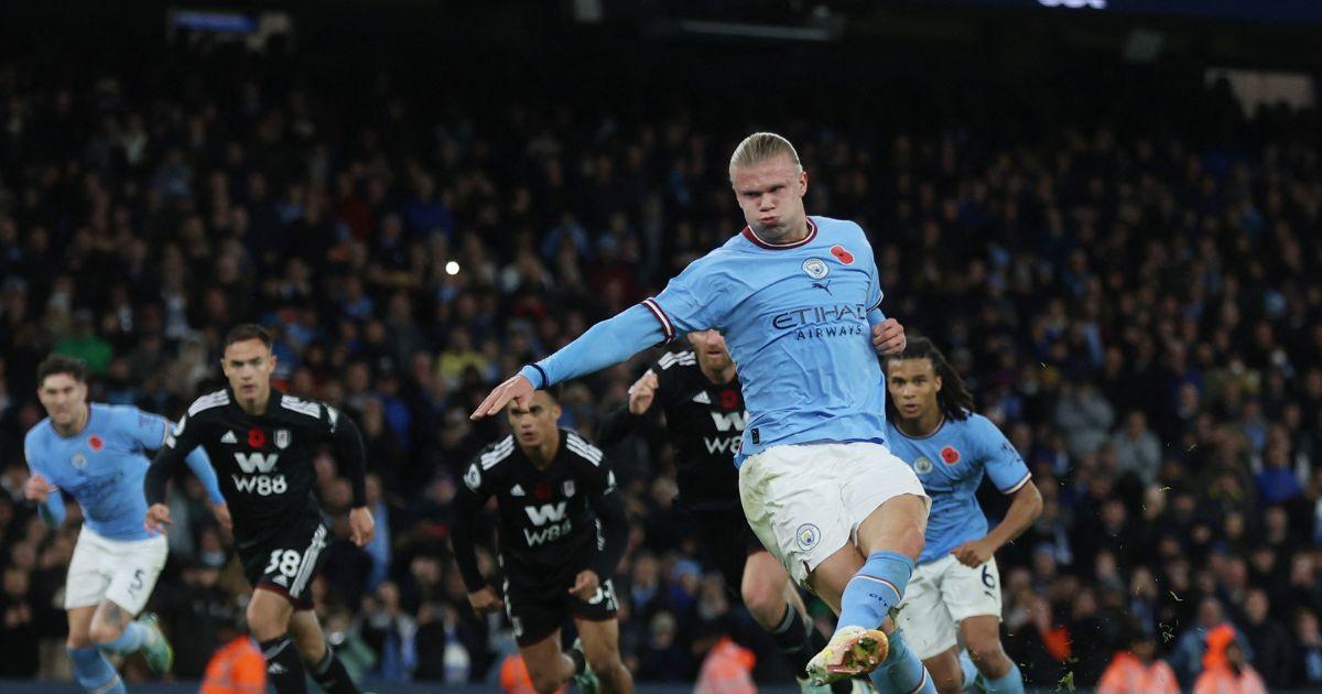 A 95th-minute penalty from substitute Erling Haaland earned 10-man Manchester City a dramatic 2-1 win over Fulham on Saturday, a victory that sent the champions back to the top of the Premier League.