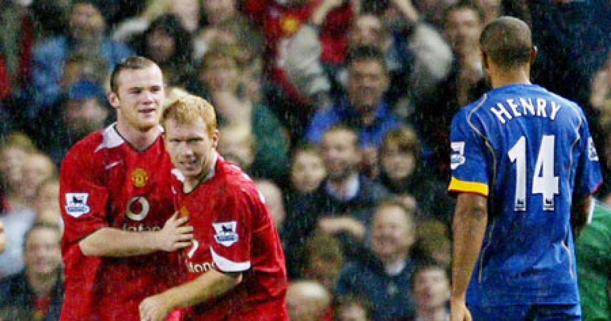 Image: Manchester United's Wayne Rooney (L) celebrates his goal with Paul Scholes (C) watched by Arsenal's Thierry Henry (R) during their English Premier League soccer match at Old Trafford, Manchester, October 24, 2004