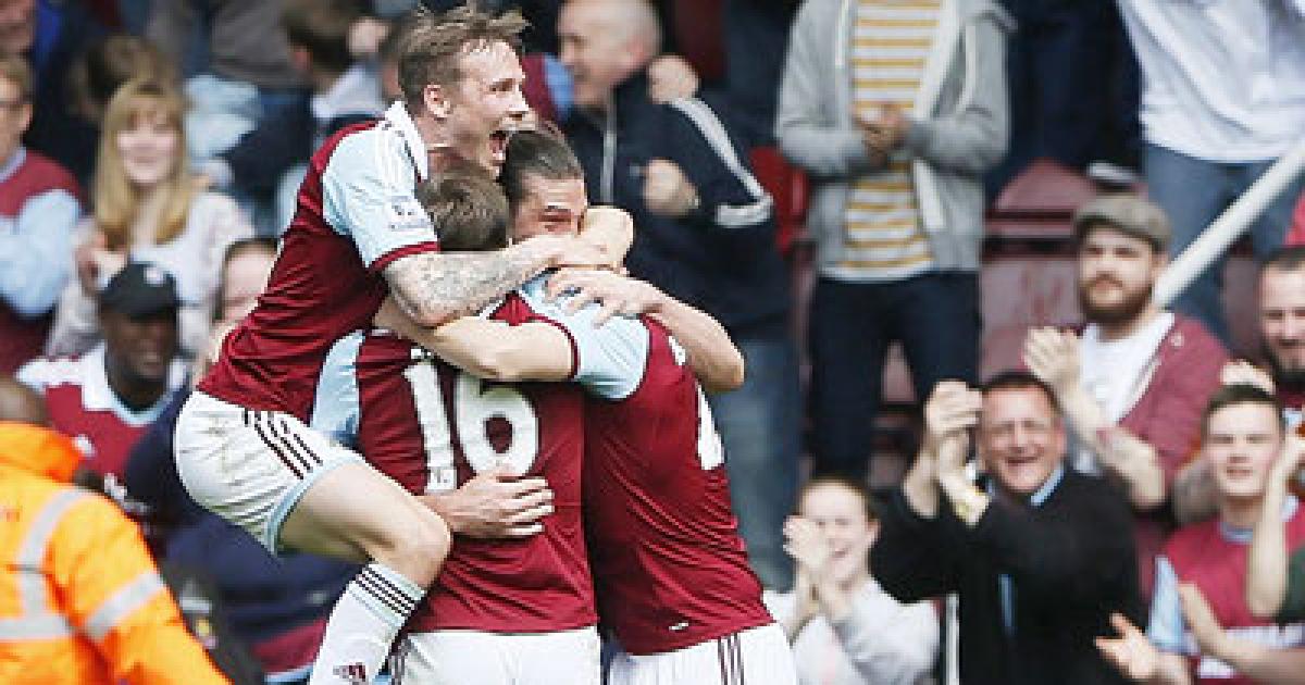 Image: Stewart Downing (right) of West Ham United is mobbed by teammates after scoring against Tottenham Hotspur during their English Premier League match at Upton Park in London on Saturday