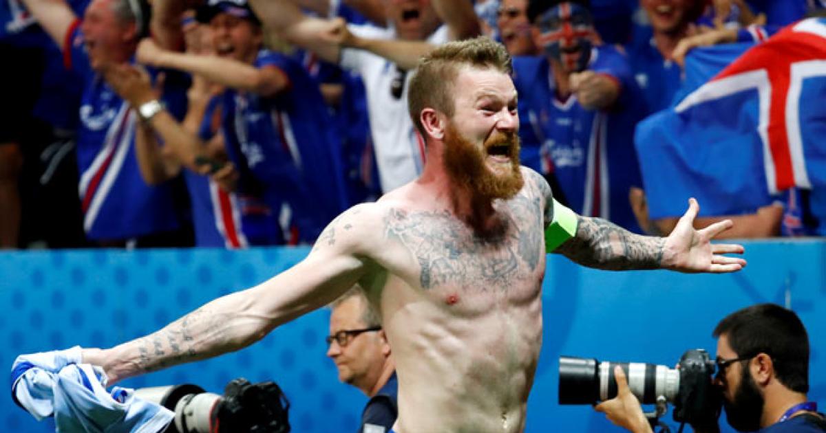 IMAGE: Iceland's Aron Gunnarsson celebrates winning the Euro 2016 round of 16 match against England. Photograph: Michael Dalder/Reuters