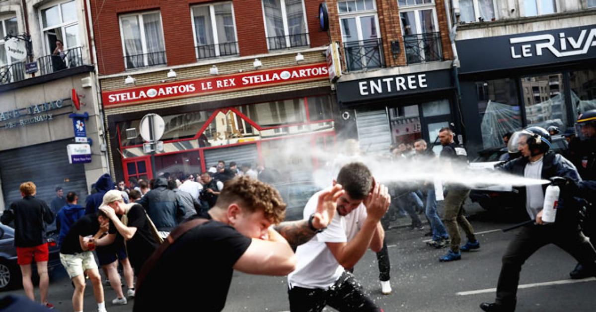 IMAGE: England football fans clash with police in Lille on Wednesday.Police used tear gas and pepper spray on the fans in a bid to keep public order in the city centre. Photograph: Carl Court/Getty Images