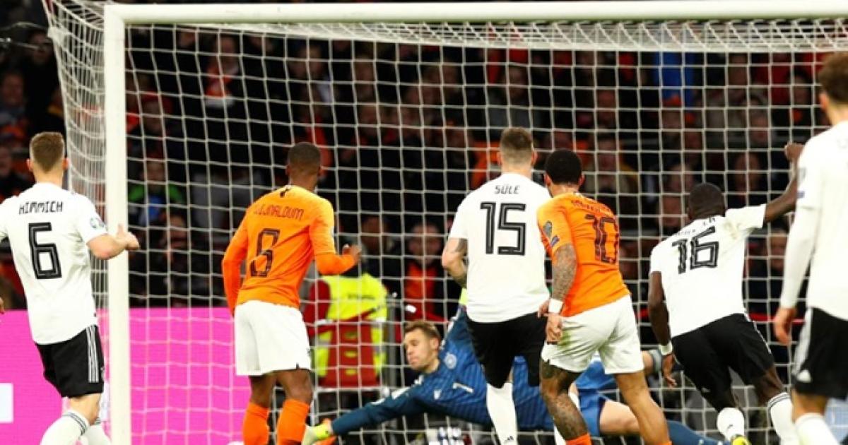 The Dutch pulled one back within three minutes of the halftime break though as Depay provided an inviting cross for teenage defender De Ligt to head home his first international goal.