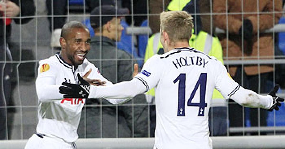 Image: Tottenham Hotspur's Lewis Holtby (right) and Jermain Defoe celebrate a goal scored against Anzhi Makhachkala during their Europa League match at the Saturn stadium in Ramenskoye, near Moscow on Thursday