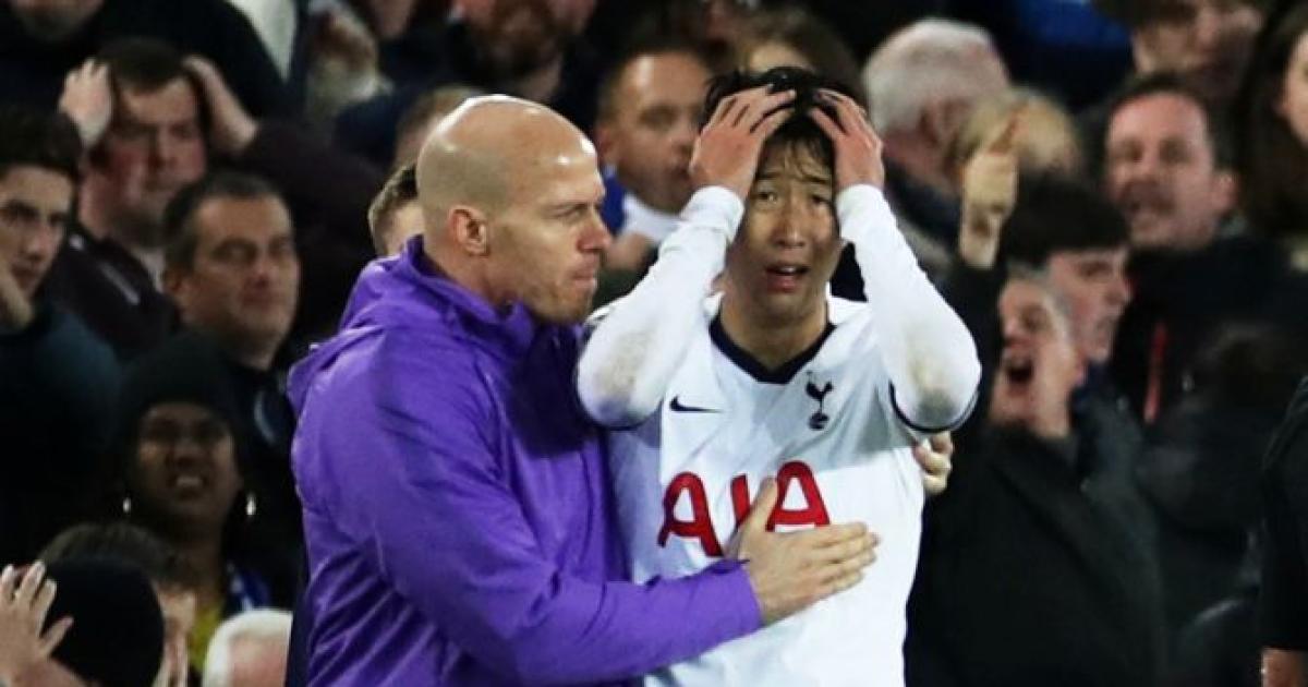 Tottenham Hotspur's Son Heung-min looks dejected after Everton's Andre Gomes sustains an injury after tackling him during their English Premier League match at Goodison Park in Liverpool on Sunday