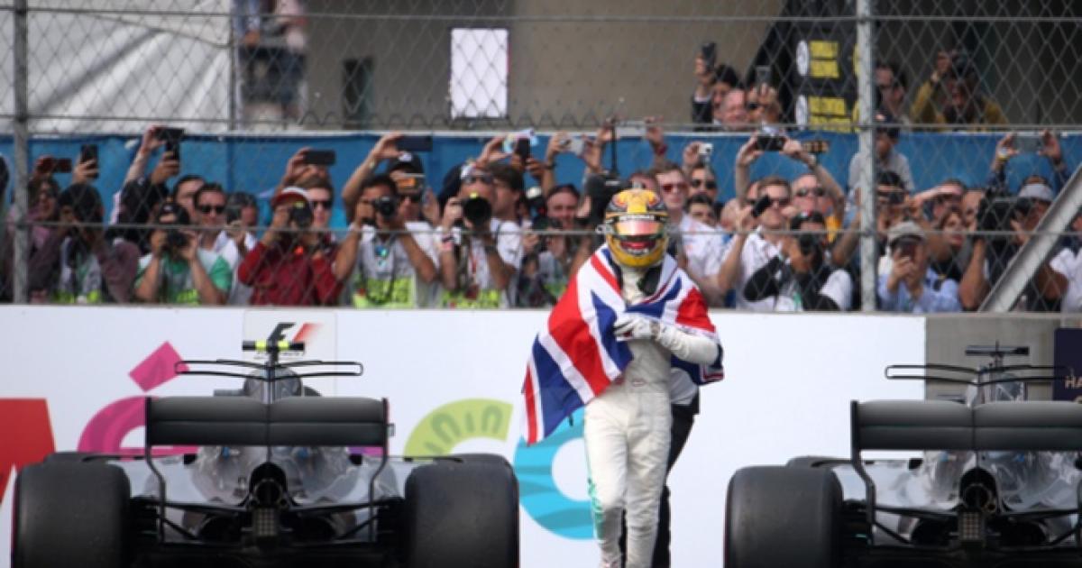 Hamilton put his hands to his helmet, before producing the British flag for his slowing down lap. He then draped it around his shoulders, standing on the car before embracing his mechanics.